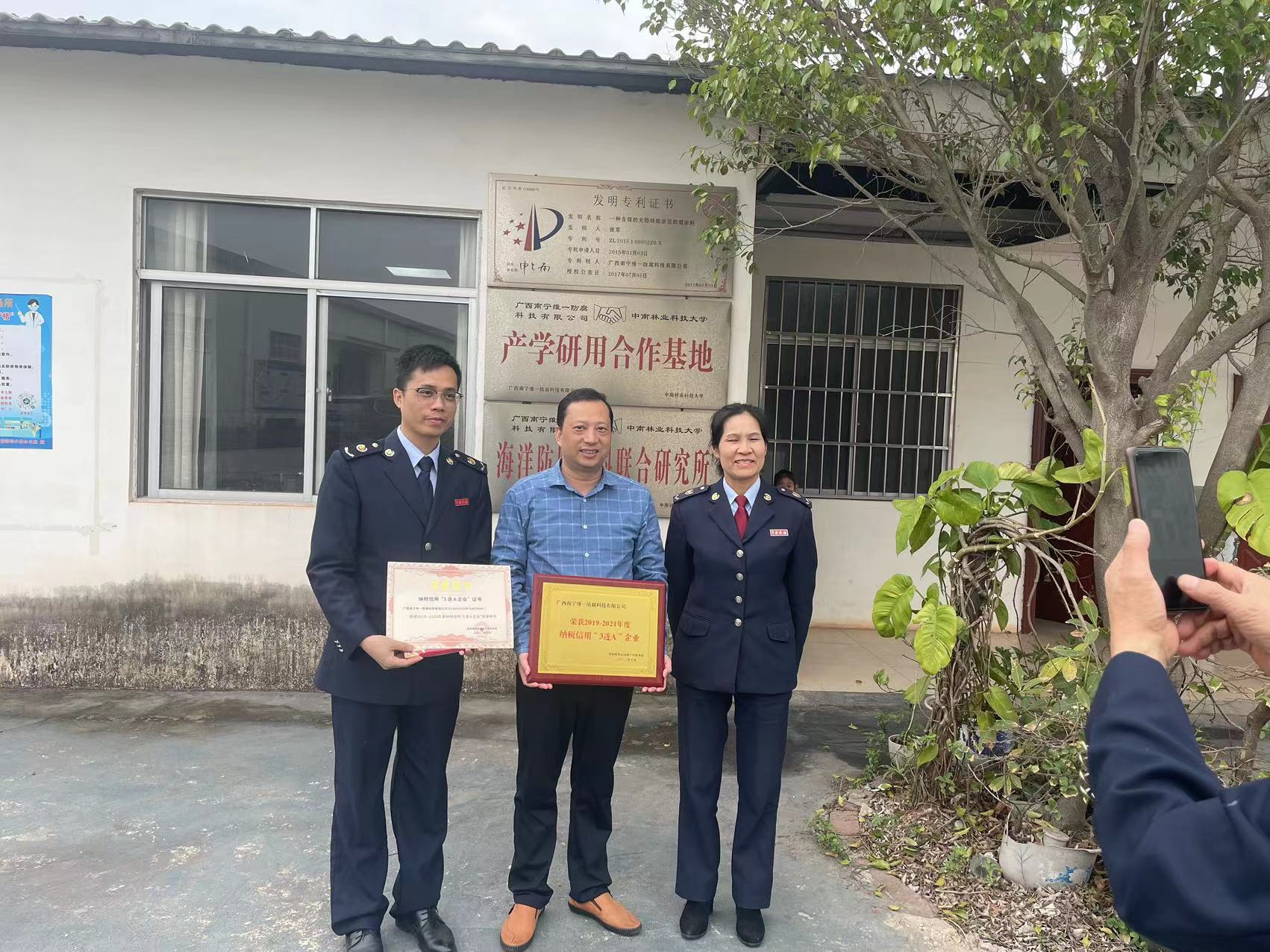好雨知節,捷報頻傳。2023年春節公司復工投產之際國家稅務總局南寧市稅務局領導一行三人,專程為我公司送來燙金牌匾,公司喜獲2019~2021年度納稅信用“3連A企業”證書。